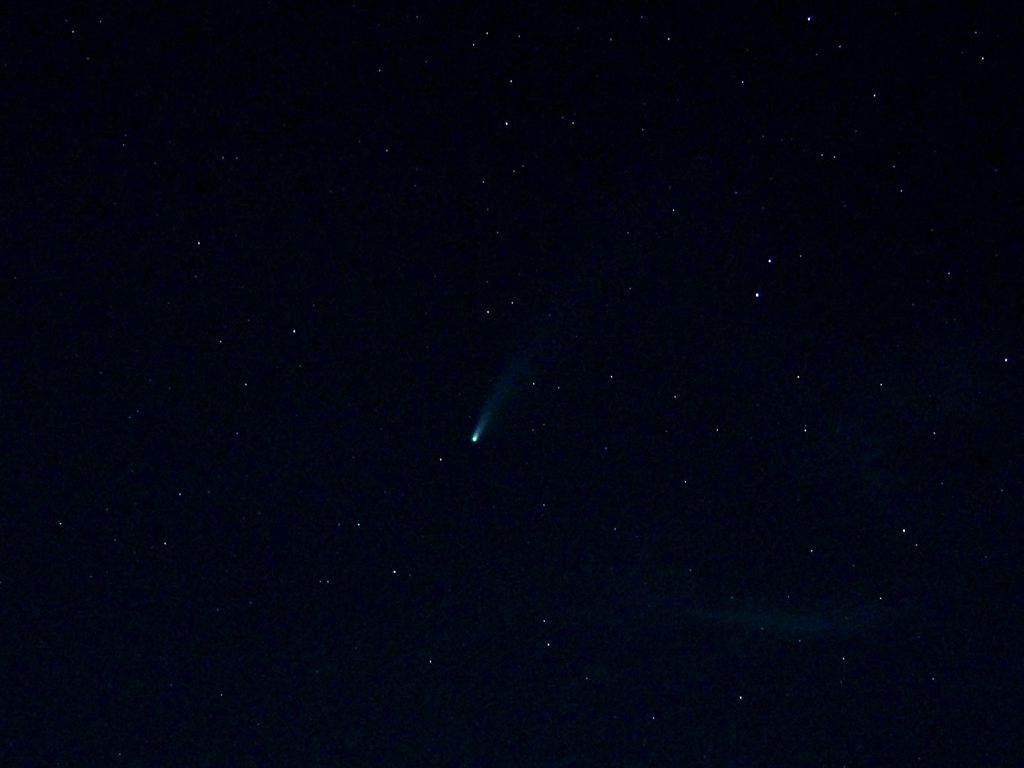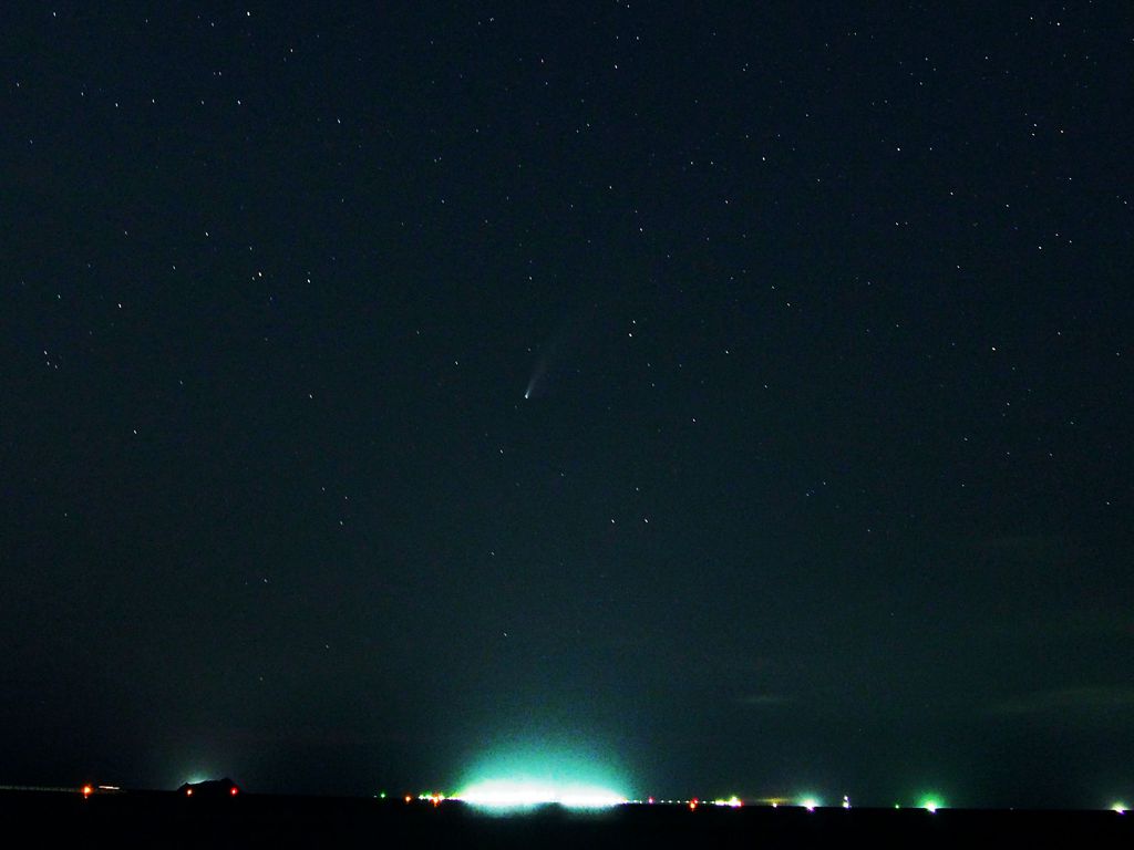 | 市内北端近くの海岸で彗星を撮りました。 10基の風力発電装置が鈍い音を立てる中、真っ暗な海に吹く風と波の音が心地よい恐怖感を演出してくれます。 ネオワイズ彗星、わずか3ヶ月半前にアメリカの赤外線観測衛星NEOWISEで発見されたそうで、最接近で肉眼でも見えやすい一等星から二等星程度の明るさ、今はもう三等星を切るくらいだから、都会で肉眼はちょっと難しいかなぁ。。。 見える時間や方角も、日本では日暮れ後の北西に数時間と夜明け前の北東で数時間、高度もそんなに高くないから、地形や構造物のほか、雲や雲谷の影響を避けるためには、地平線や水平線が見通せる場所かな。 このところずっと雨だったから、今日、明日見れなかったら次の機会を・・・ なんて思っていたら、次は6,800年程先の西暦8786年頃訪れるとの事、さすがにそこまでは待つ自信もない事から行ってみる事に。 双眼鏡を持参していなかったら見つけられなかったかも知れないこの直径約5Kmの小天体は、太陽系の外枠を超えたあたりから、太陽の引力に引かれてここまでやって来て、また数千年を掛けて帰っていく。 この星が次に見る地球はどんなだろう? 10年後や100年後はなんとなく想像できても、6800年後は地球や人類の存在さえ予想つかないよ。 |